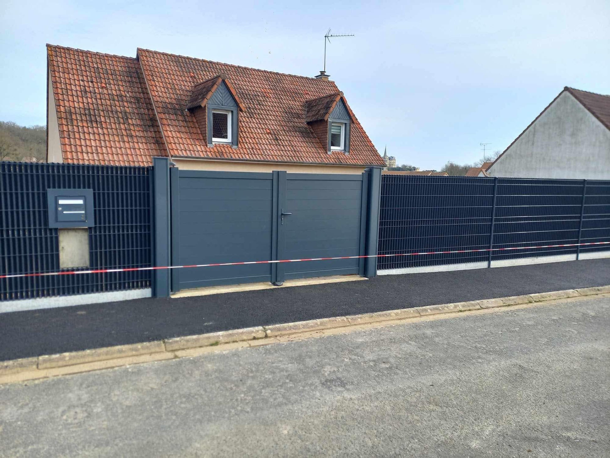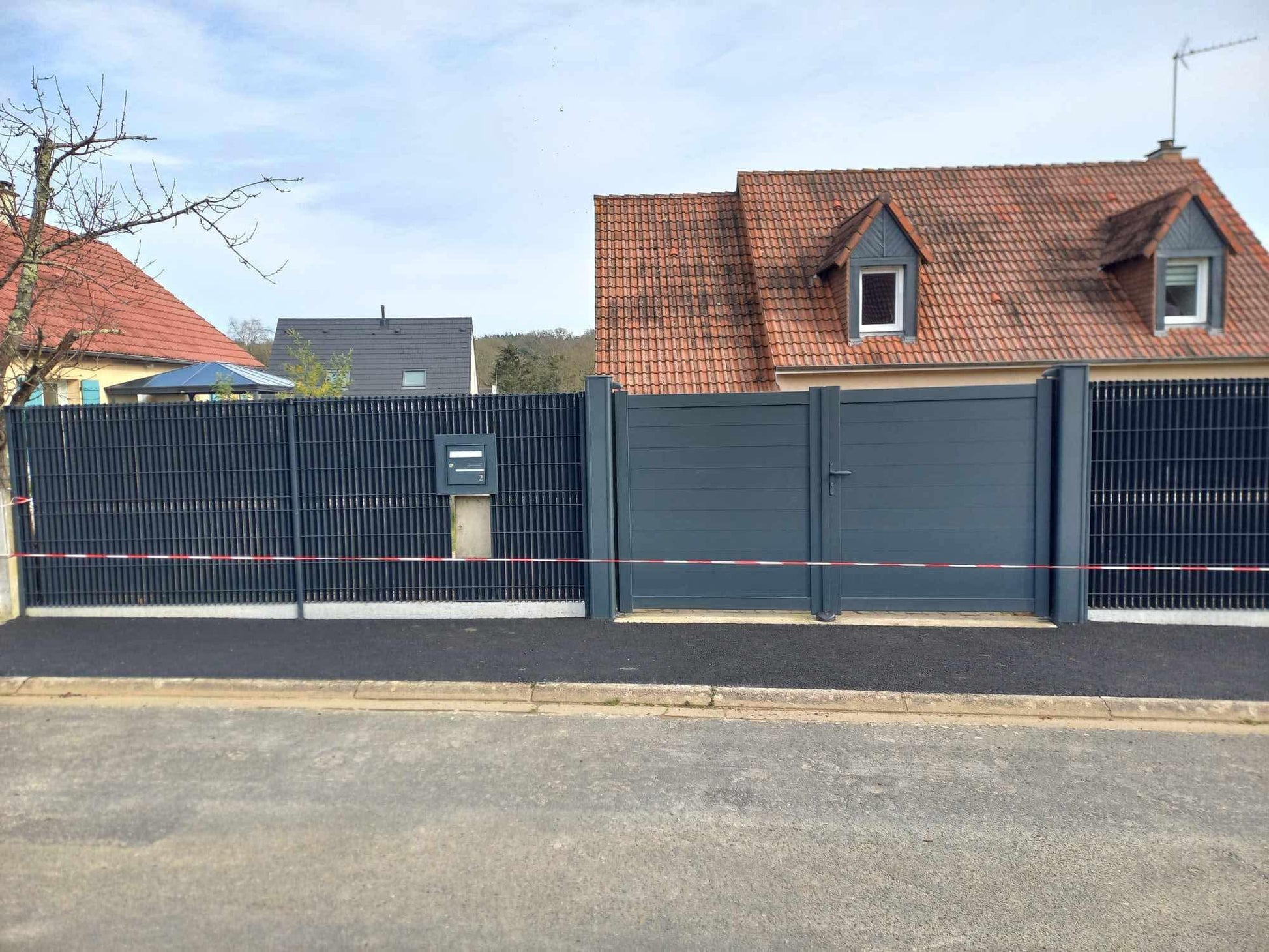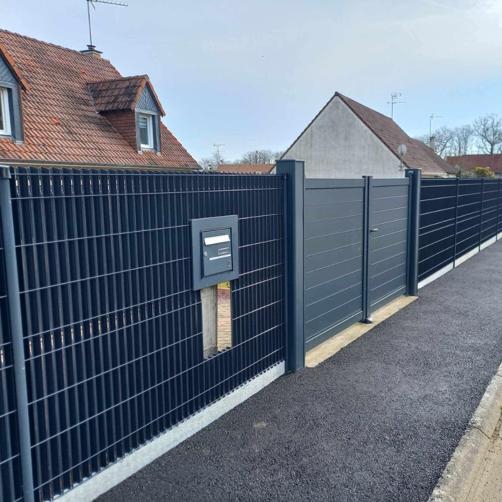 - Clôture rigide BETAFENCE avec plaque de soubassement en béton et système d’occultation ARCAL (modèle JUGO).