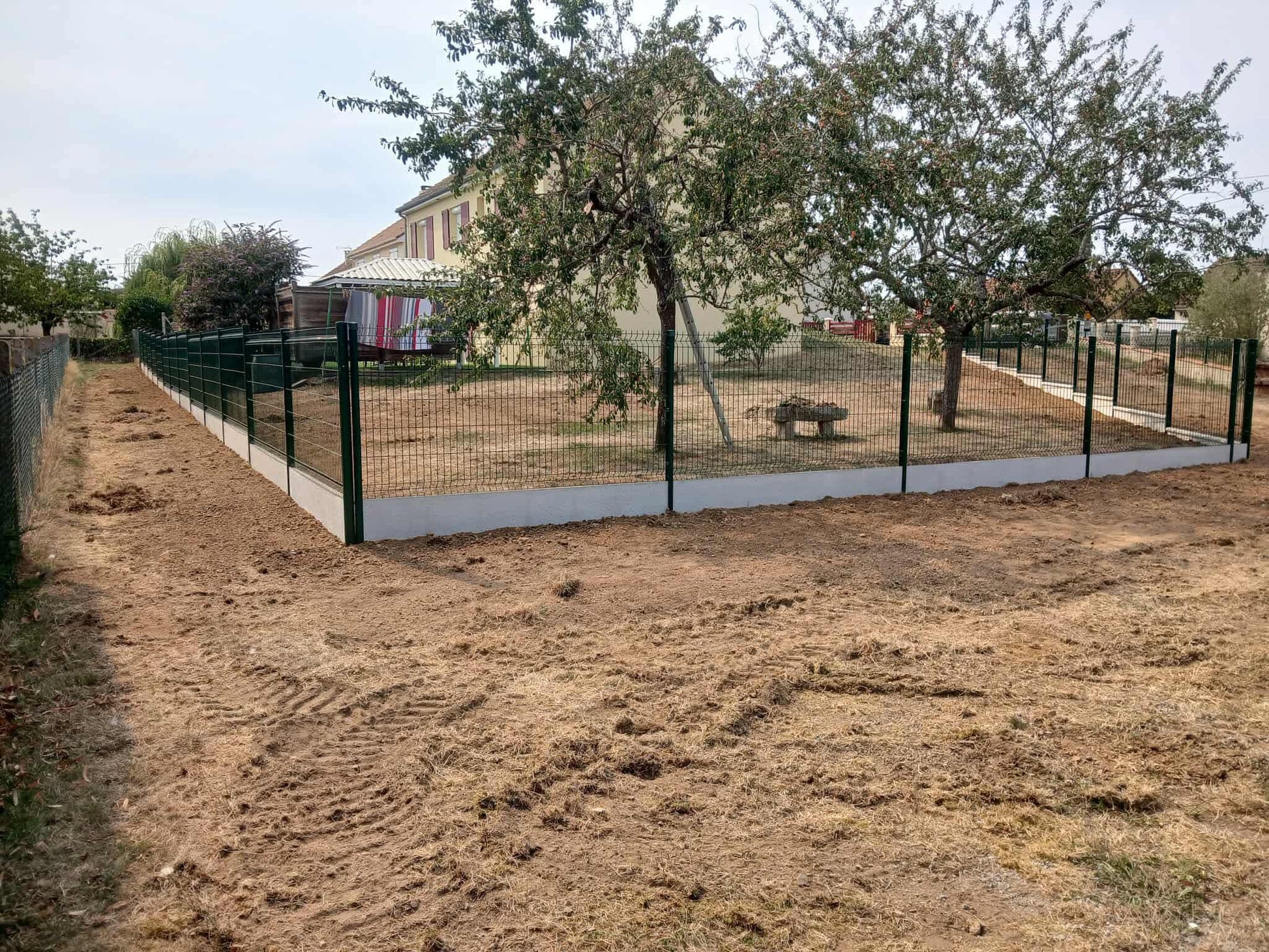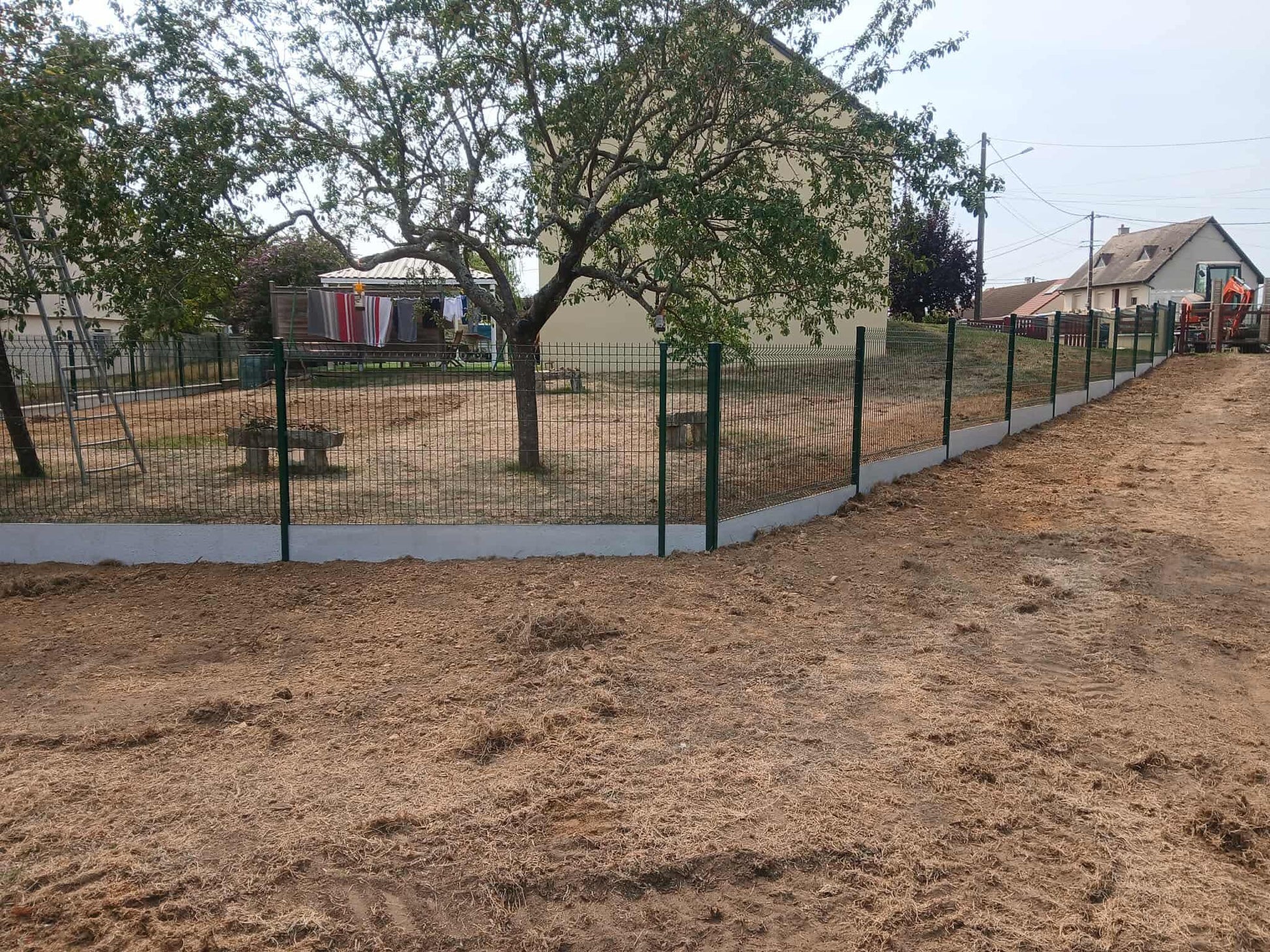 Clôture rigide de marque BETAFENCE (coloris vert RAL 6005) avec panneau grillage de hauteur 123 cm et plaque de soubassement en béton de hauteur 35 cm.