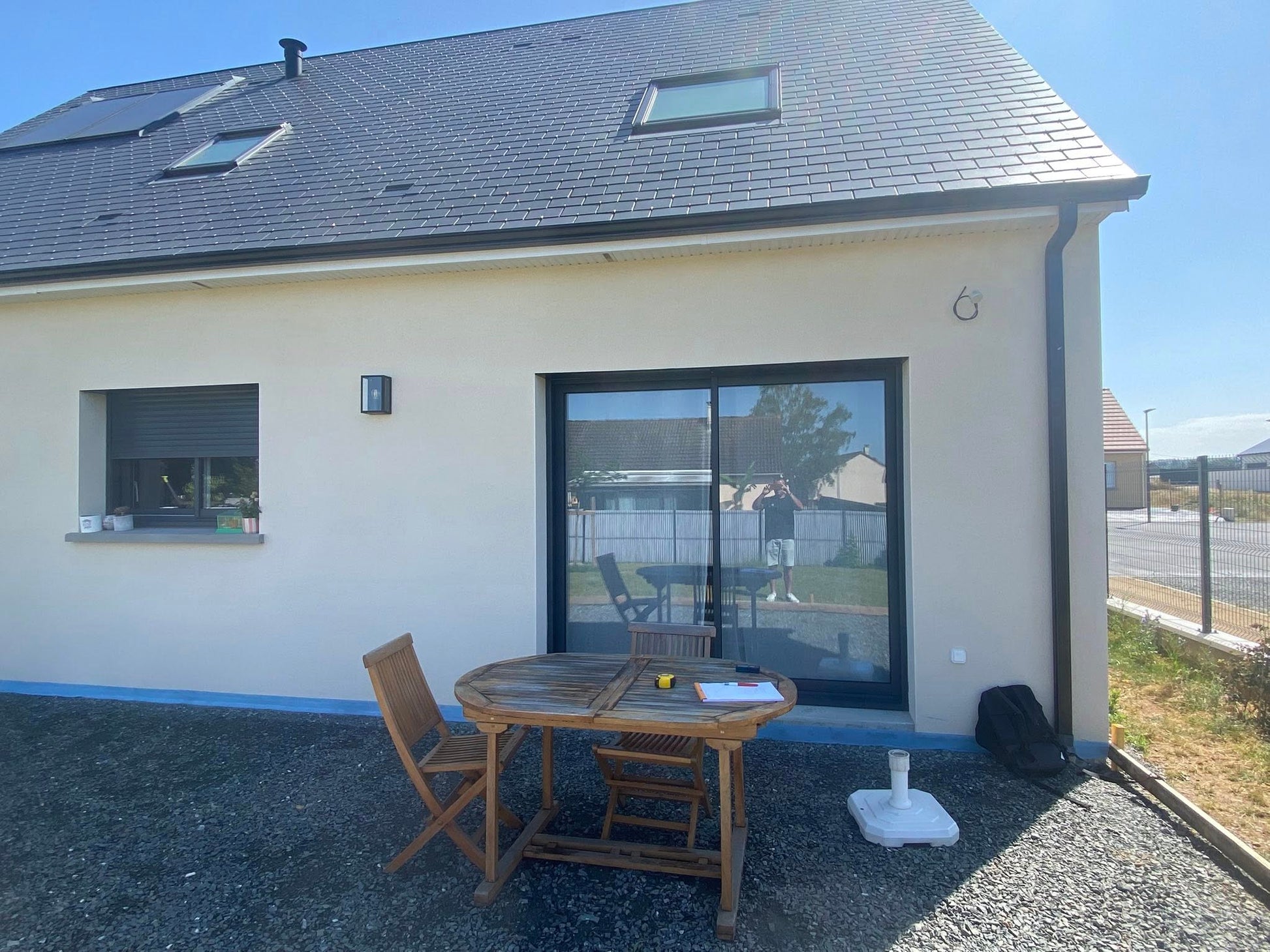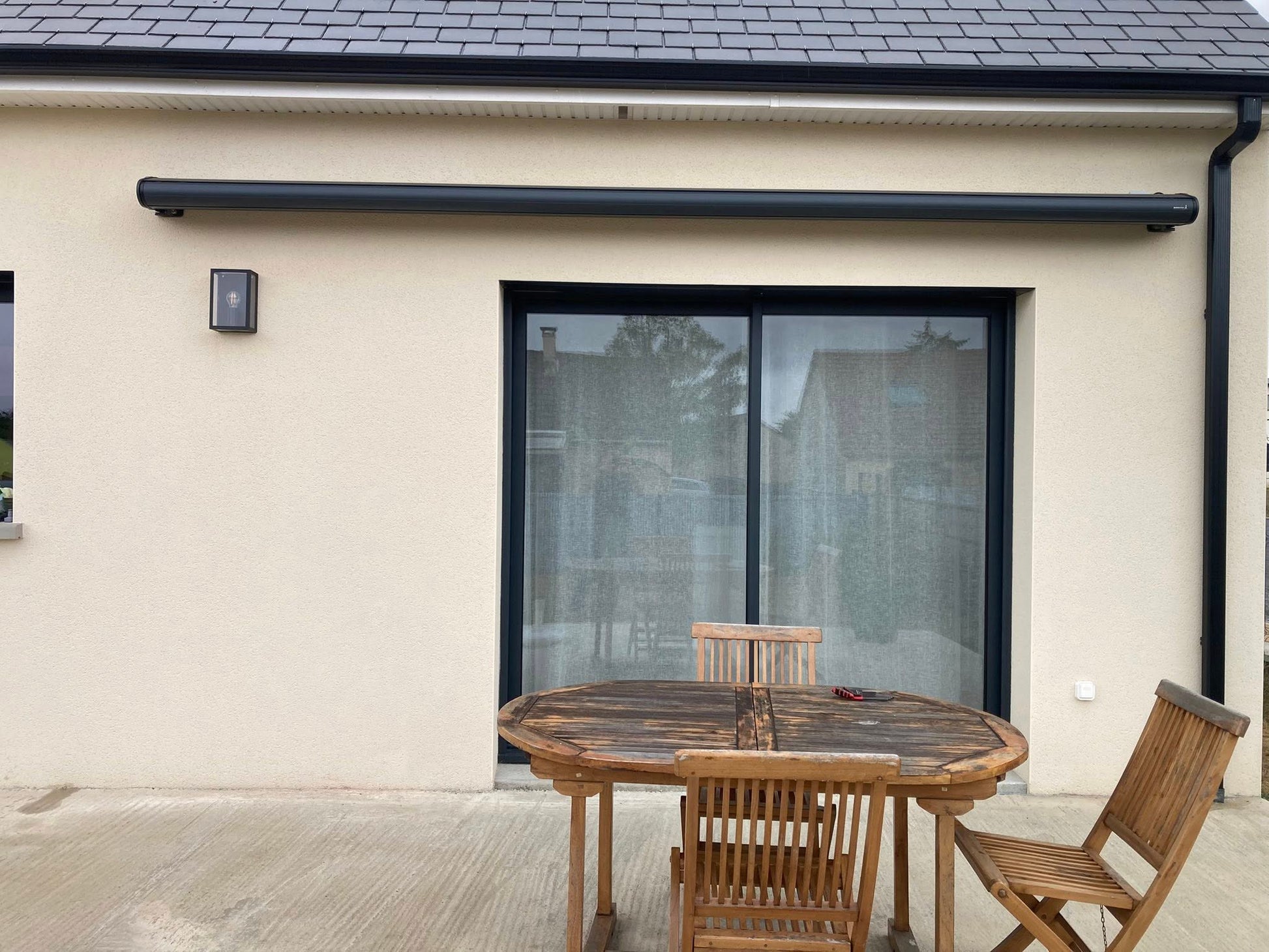 Store banne motorisé de marque MARQUISES, modèle AMBRE LUX (motorisation SOMFY, éclairage et toile acrylique).